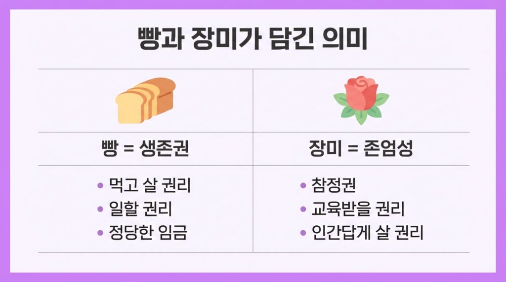 빵은 생존권을 의미합니다. 먹고 살 권리, 일할 권리, 정당한 임금을 받을 권리입니다. 당시 여성들은 남성과 같은 일을 해도 훨씬 적은 임금을 받았습니다. 장시간 노동과 위험한 작업 환경 속에서 생계를 이어가야 했습니다.