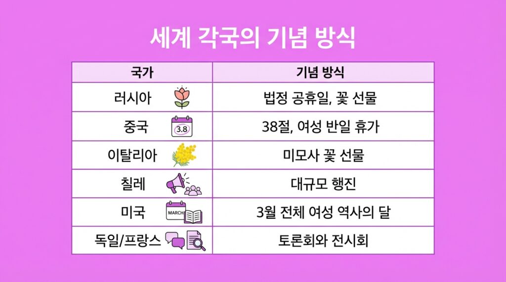 미국은 3월 전체를 여성 역사의 달로 지정합니다. 한 달 동안 여성의 업적을 기리는 다양한 행사와 교육 프로그램이 진행됩니다. 독일과 프랑스 등 유럽 국가들은 토론회와 전시회를 개최하며, 호주에서는 아침 일찍 여성들이 모여 함께 걷는 이벤트가 열립니다.