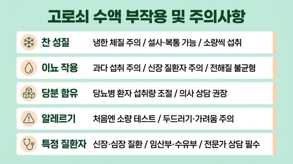 | 특정 질환자 | 신장, 심장 질환, 당뇨병 등은 의사 상담 후 섭취 |