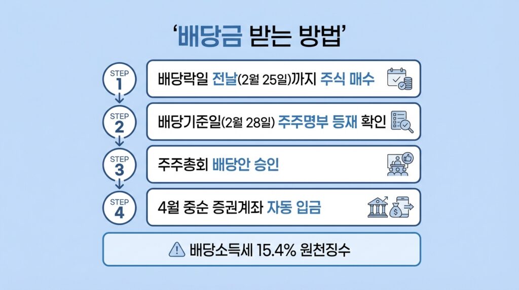 배당금을 받기 위해서는 배당락일 전날까지 주식을 매수해야 합니다. 2026년 4분기 배당 기준으로는 2월 25일까지 주식을 보유하고 있어야 배당 권리를 얻을 수 있습니다. 배당락일인 2월 26일 이후에 주식을 매수하면 해당 배당을 받을 수 없습니다.