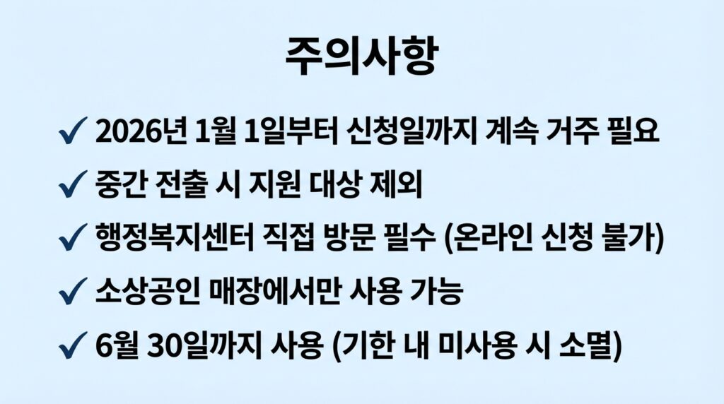 영동군 민생안정지원금을 신청하고 사용할 때 몇 가지 주의해야 할 사항이 있습니다. 먼저 지원 대상 기준일인 2026년 1월 1일부터 신청일까지 계속해서 영동군에 주민등록을 둔 주민만 신청이 가능합니다. 중간에 전출한 경우에는 지원 대상에서 제외됩니다.