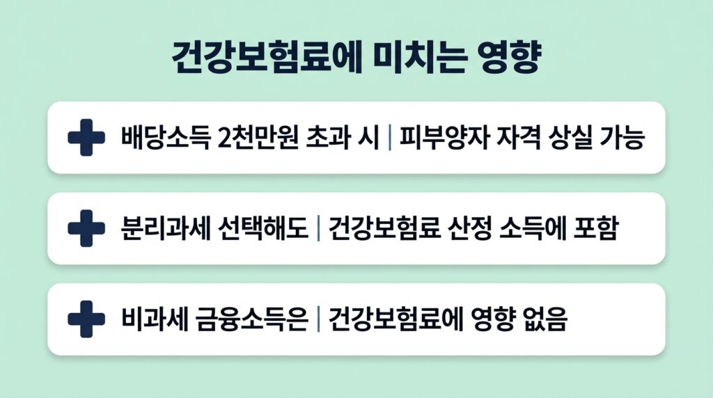 중요한 점은 분리과세를 선택하더라도 건강보험료 산정에는 영향을 미친다는 것입니다. 배당소득 자체가 소득으로 인정되기 때문에 피부양자 탈락 요건에 포함됩니다.